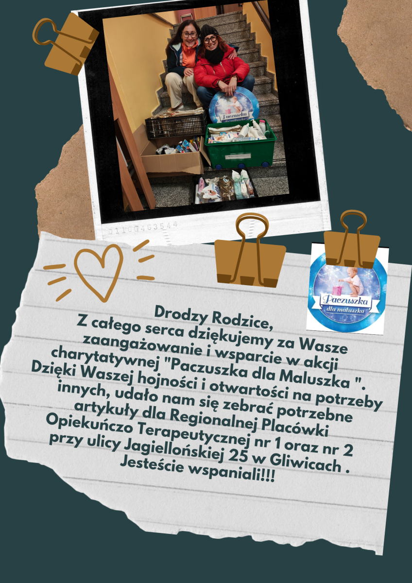Dyrekcja wraz z nauczycielami ZPM nr 2 PM nr 25 oraz ZPM nr 2 PM nr 6 w Gliwicach składają serdeczne podziękowania rodzicom za zaangażowanie i wsparcie akcji charytatywnej pt. „ Paczuszka dla Maluszka”.