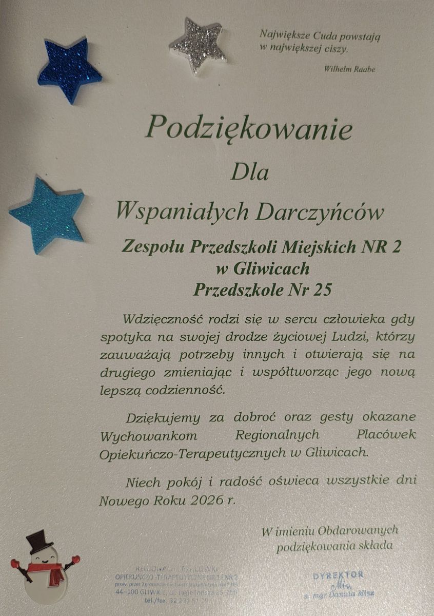 W dniu 02.01.2025r. dary zostały przekazane Regionalnej Placówce Opiekuńczo-Terapeutycznej nr 1 i nr 2 mieszczącej się przy ulicy Jagielońskiej25 w Gliwicach.